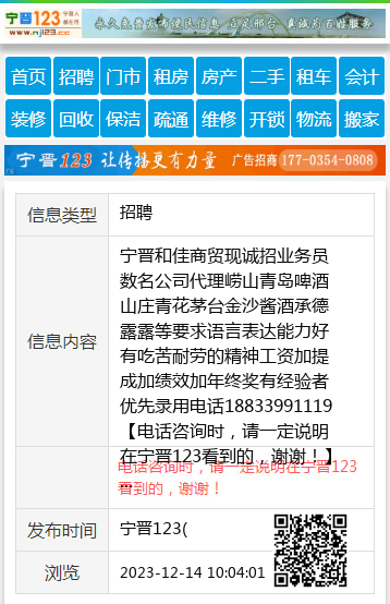宁晋和佳商贸现诚招业务员数名公司代理崂山青岛啤酒山庄青花茅台金沙酱酒承德露露等要求语言表达能力好有吃苦耐劳的精神工资加提成加绩效加年终奖有经验者优先录用电话18833991119 【电话咨询时,请一定说明在宁晋123看到的,谢谢!】 |