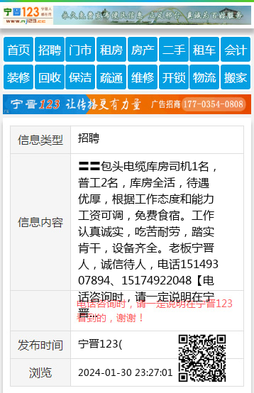 〓〓包头电缆库房司机1名,普工2名,库房全活,待遇优厚,根据工作态度和能力工资可调,免费食宿。工作认真诚实,吃苦耐劳,踏实肯干,设备齐全。老板宁晋人,诚信待人,电话15149307894、15174922048 【电话咨询时,请一定说明在宁晋123看到的,谢谢!】 |