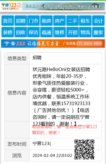 状元路HelloOni女装店招聘优秀姐妹,年龄20-35岁,形象气质佳热爱服装行业,会穿搭,薪资轻松5000+,店内供餐,恒温系统工作环境优越,联系15731923133(广告其他勿扰!) 【电话咨询时,请一定说明在宁晋123看到的,谢谢!】 |