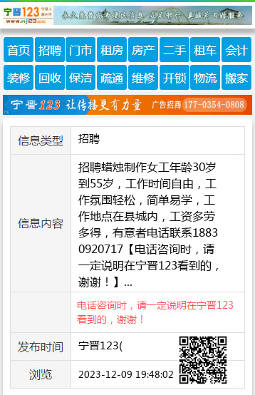 招聘蜡烛制作女工年龄30岁到55岁,工作时间自由,工作氛围轻松,简单易学,工作地点在县城内,工资多劳多得,有意者电话联系18830920717 【电话咨询时,请一定说明在宁晋123看到的,谢谢!】 |