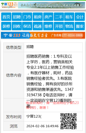 招聘医药销售:1.专科及以上学历,医药,营销类相关专业2.1年以上销售工作经验,有医疗器材,耗材,药品销售经验者优先。3.有医院销售经验,拥有良好的诊所资源和销售渠道优先。13473194738 【电话咨询时,请一定说明在宁晋123看到的,谢谢!】 |