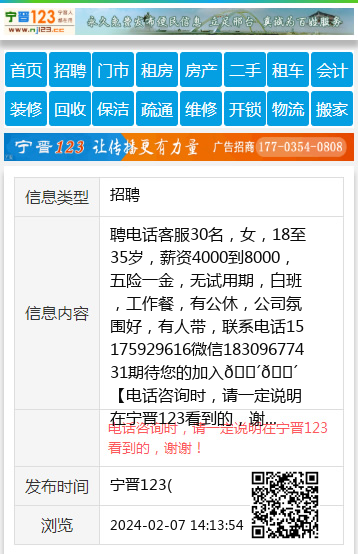 聘电话客服30名,女,18至35岁,薪资4000到8000,五险一金,无试用期,白班,工作餐,有公休,公司氛围好,有人带,联系电话15175929616微信18309677431期待您的加入🌴🌴 【电话咨询时,请一定说明在宁晋123看到的,谢谢!】 |