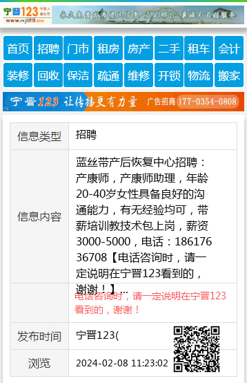 蓝丝带产后恢复中心招聘:产康师,产康师助理,年龄20-40岁女性具备良好的沟通能力,有无经验均可,带薪培训教技术包上岗,薪资3000-5000,电话:18617636708 【电话咨询时,请一定说明在宁晋123看到的,谢谢!】 |
