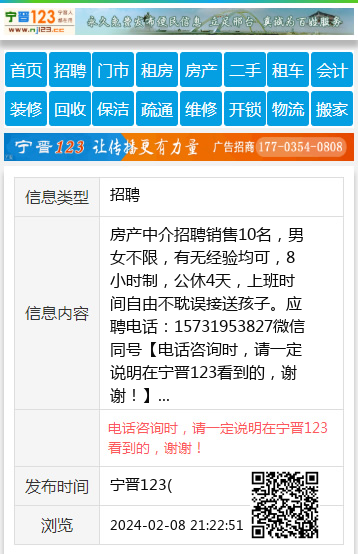 房产中介招聘销售10名,男女不限,有无经验均可,8小时制,公休4天,上班时间自由不耽误接送孩子。应聘电话:15731953827微信同号 【电话咨询时,请一定说明在宁晋123看到的,谢谢!】 |
