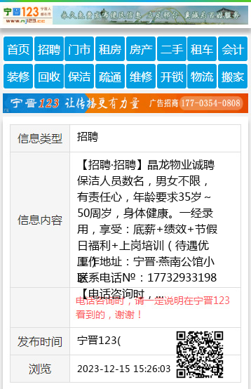 【招聘·招聘】晶龙物业诚聘保洁人员数名,男女不限,有责任心,年龄要求35岁~50周岁,身体健康。一经录用,享受:底薪+绩效+节假日福利+上岗培训(待遇优厚)