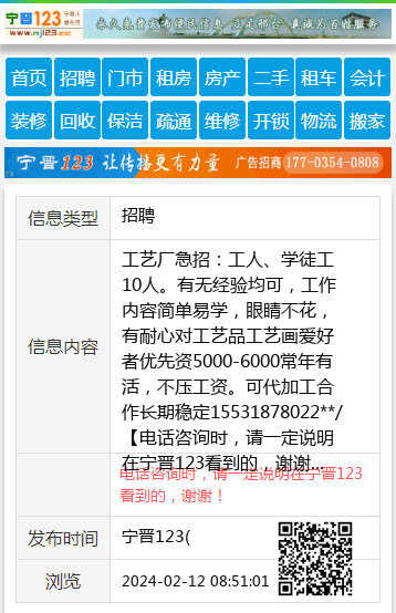 工艺厂急招:工人、学徒工10人。有无经验均可,工作内容简单易学,眼睛不花,有耐心对工艺品工艺画爱好者优先资5000-6000常年有活,不压工资。可代加工合作长期稳定15531878022**/ 【电话咨询时,请一定说明在宁晋123看到的,谢谢!】 |