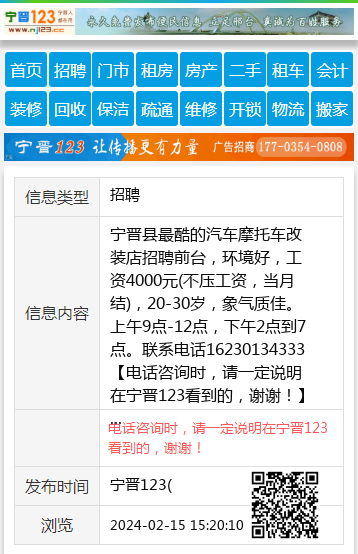宁晋县最酷的汽车摩托车改装店招聘前台,环境好,工资4000元(不压工资,当月结),20-30岁,象气质佳。上午9点-12点,下午2点到7点。联系电话16230134333 【电话咨询时,请一定说明在宁晋123看到的,谢谢!】 |