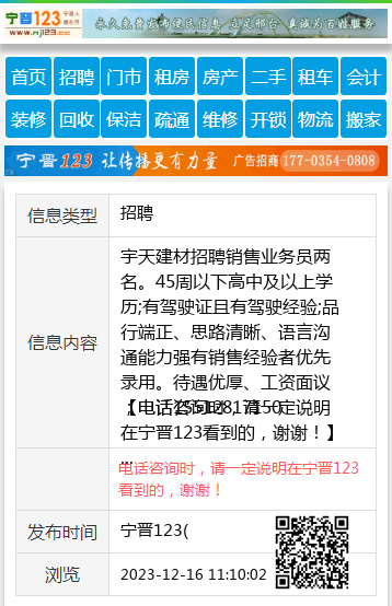 宇天建材招聘销售业务员两名。45周以下高中及以上学历;有驾驶证且有驾驶经验;品行端正、思路清晰、语言沟通能力强有销售经验者优先录用。待遇优厚、工资面议;电话15512817150