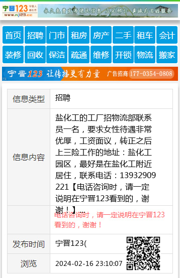 盐化工的工厂招物流部联系员一名,要求女性待遇非常优厚,工资面议,转正之后上三险工作的地址:盐化工园区,最好是在盐化工附近居住,联系电话:13932909221 【电话咨询时,请一定说明在宁晋123看到的,谢谢!】 |