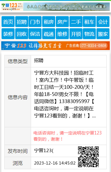 宁晋方大科技园!招临时工!室内工作!中午管饭!临时工日结一天100-200/天!年龄18-50!男女不限!【电话同微信】13383095997 【电话咨询时,请一定说明在宁晋123看到的,谢谢!】 |
