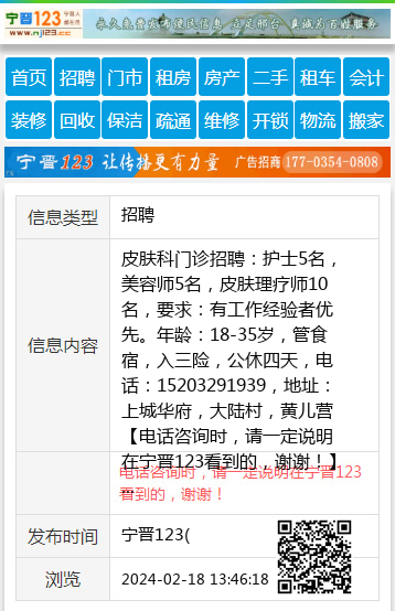 皮肤科门诊招聘:护士5名,美容师5名,皮肤理疗师10名,要求:有工作经验者优先。年龄:18-35岁,管食宿,入三险,公休四天,电话:15203291939,地址:上城华府,大陆村,黄儿营 【电话咨询时,请一定说明在宁晋123看到的,谢谢!】 |