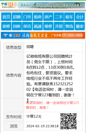 亿驰电缆有限公司招聘统计员(男女不限),上班时间8点到12点,13点30到18点。包吃包住,薪资面议。要求电缆行业不低于两年工作经验。有意请联系15232125202 【电话咨询时,请一定说明在宁晋123看到的,谢谢!】 |