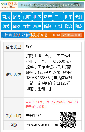 招聘主播一名,一天工作4小时,一个月工资3500元+提成,工作地点北河庄镇素邱村,有意者可以来电咨询18033778886 【电话咨询时,请一定说明在宁晋123看到的,谢谢!】 |