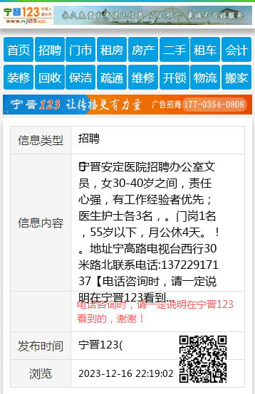 宁晋安定医院招聘办公室文员,女30-40岁之间,责任心强,有工作经验者优先;医生护士各3名,。门岗1名,55岁以下,月公休4天。!。地址宁高路电视台西行30米路北联系电话:13722917137 【电话咨询时,请一定说明在宁晋123看到的,谢谢!】 |