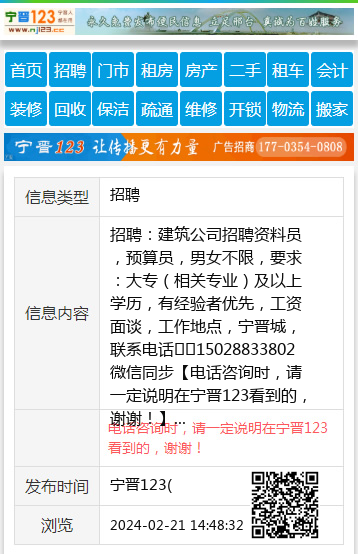 招聘:建筑公司招聘资料员,预算员,男女不限,要求:大专(相关专业)及以上学历,有经验者优先,工资面谈,工作地点,宁晋城,联系电话☎️15028833802微信同步 【电话咨询时,请一定说明在宁晋123看到的,谢谢!】 |