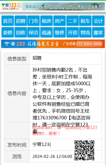 孙村招销售内勤2名,不出差,坐班8小时工作制,每周休一天,底薪加提成5000以上,要求:女,25-35岁,中专及以上学历,会使用办公软件有销售经验已婚已育者优先,手机微信同号王经理17633096700 【电话咨询时,请一定说明在宁晋123看到的,谢谢!】 |