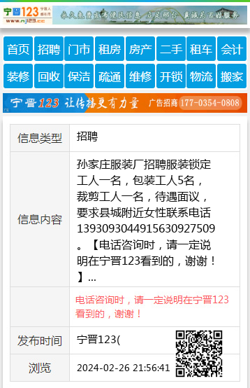 孙家庄服装厂招聘服装锁定工人一名,包装工人5名,裁剪工人一名,待遇面议,要求县城附近女性联系电话1393093044915630927509。 【电话咨询时,请一定说明在宁晋123看到的,谢谢!】 |