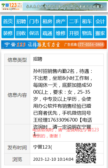 孙村招销售内勤2名,待遇:不出差,坐班8小时工作制,每周休一天,底薪加提成5000以上,要求:女,25-35岁,中专及以上学历,会使用办公软件有销售经验已婚已育者优先,手机微信同号王经理17633096700 【电话咨询时,请一定说明在宁晋123看到的,谢谢!】 |