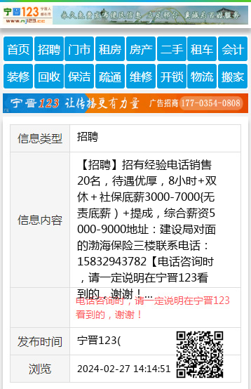 【招聘】招有经验电话销售20名,待遇优厚,8小时+双休+社保底薪3000-7000{无责底薪)+提成,综合薪资5000-9000地址:建设局对面的渤海保险三楼联系电话:15832943782 【电话咨询时,请一定说明在宁晋123看到的,谢谢!】 |