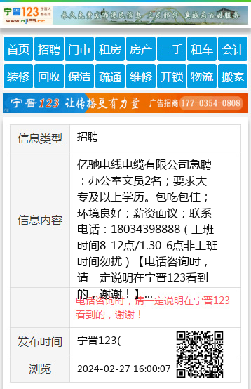 亿驰电线电缆有限公司急聘:办公室文员2名;要求大专及以上学历。包吃包住;环境良好;薪资面议;联系电话:18034398888(上班时间8-12点/1.30-6点非上班时间勿扰) 【电话咨询时,请一定说明在宁晋123看到的,谢谢!】 |