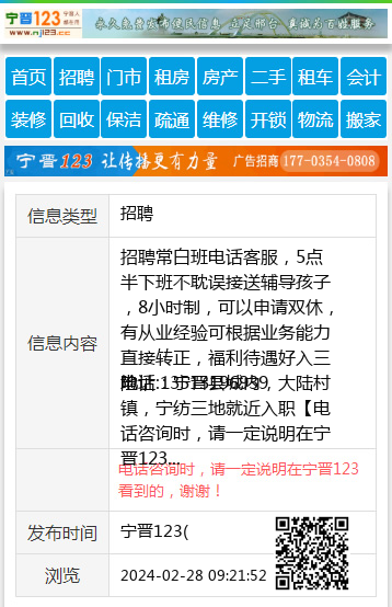 | 防骗提醒: | 宁晋123(www.nj123.cc)提醒您:手工活、网络兼职、刷单,都是骗子!凡以各种名义收取费用的都是骗子!找工作是往兜里挣钱,让你往外掏钱的都是骗子!异地招聘请提高警惕,谨防诈骗! |