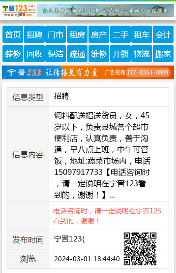 调料配送招送货员,女,45岁以下,负责县城各个超市便利店,认真负责,善于沟通,早八点上班,中午可管饭,地址:蔬菜市场内,电话15097917733 【电话咨询时,请一定说明在宁晋123看到的,谢谢!】 |
