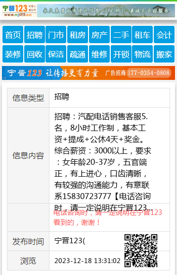 招聘:汽配电话销售客服5.名,8小时工作制,基本工资+提成+公休4天+奖金。综合薪资:3000以上,要求:女年龄20-37岁,五官端正,有上进心,口齿清晰,有较强的沟通能力,有意联系15830723777 【电话咨询时,请一定说明在宁晋123看到的,谢谢!】 |