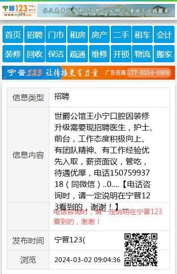 世爵公馆王小宁口腔因装修升级需要现招聘医生,护士、前台,工作态度积极向上、有团队精神、有工作经验优先入取,薪资面议,管吃,待遇优厚,电话15075993718(同微信)..0.... 【电话咨询时,请一定说明在宁晋123看到的,谢谢!】 |