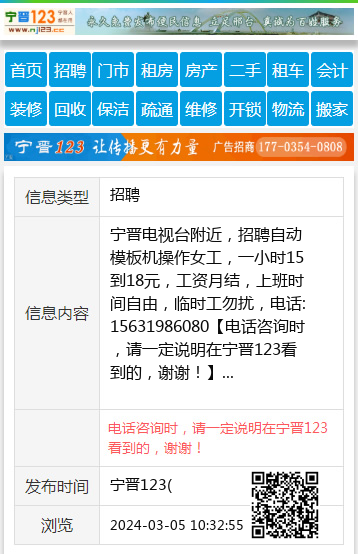 宁晋电视台附近,招聘自动模板机操作女工,一小时15到18元,工资月结,上班时间自由,临时工勿扰,电话:15631986080 【电话咨询时,请一定说明在宁晋123看到的,谢谢!】 |