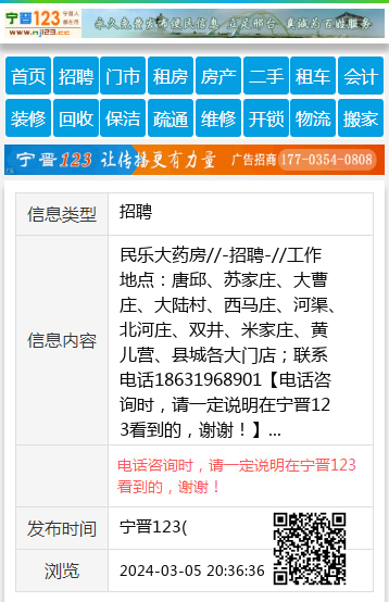 民乐大药房//-招聘-//工作地点:唐邱、苏家庄、大曹庄、大陆村、西马庄、河渠、北河庄、双井、米家庄、黄儿营、县城各大门店;联系电话18631968901 【电话咨询时,请一定说明在宁晋123看到的,谢谢!】 |