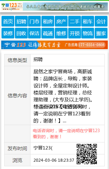 居然之家宁晋商场,高薪诚聘:品牌店长,导购,家装设计师,全屋定制设计师。楼层经理,营销经理,总经理助理,(大专及以上学历)。待遇面议18731995691