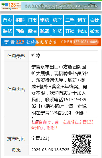 宁晋永丰出口小方瓶团队因扩大规模,现招聘业务员5名。薪资待遇优厚,底薪+提成+餐补+奖金+年终奖。男女不限,欢迎有志之士加入我们。联系电话15131933982 【电话咨询时,请一定说明在宁晋123看到的,谢谢!】 |