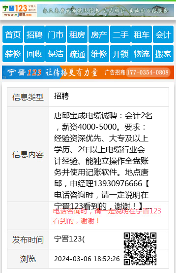 唐邱宝成电缆诚聘:会计2名,薪资4000-5000。要求:经验资深优先、大专及以上学历、2年以上电缆行业会计经验、能独立操作全盘账务并使用记账软件。地点唐邱,申经理13930976666 【电话咨询时,请一定说明在宁晋123看到的,谢谢!】 |