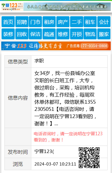 女34岁,找一份县城办公室文职的长白班工作,大专,做过前台,采购,培训机构教务,有工作经验,每周双休单休都可。微信联系13552305051 【电话咨询时,请一定说明在宁晋123看到的,谢谢!】 |