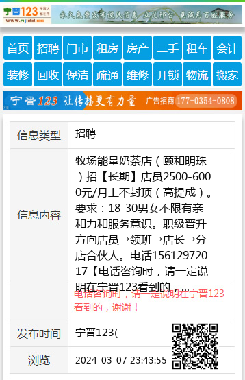 牧场能量奶茶店(颐和明珠)招【长期】店员2500-6000元/月上不封顶(高提成)。要求:18-30男女不限有亲和力和服务意识。职级晋升方向店员→领班→店长→分店合伙人。电话15612972017 【电话咨询时,请一定说明在宁晋123看到的,谢谢!】 |