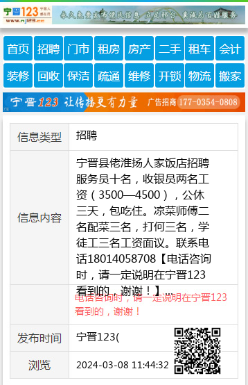 宁晋县佬淮扬人家饭店招聘服务员十名,收银员两名工资(3500—4500),公休三天,包吃住。凉菜师傅二名配菜三名,打何三名,学徒工三名工资面议。联系电话18014058708 【电话咨询时,请一定说明在宁晋123看到的,谢谢!】 |