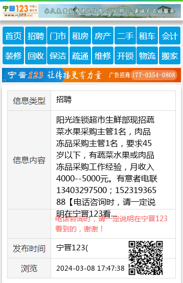 阳光连锁超市生鲜部现招蔬菜水果采购主管1名,肉品冻品采购主管1名,要求45岁以下,有蔬菜水果或肉品冻品采购工作经验,月收入4000--5000元。有意者电联13403297500;15231936588 【电话咨询时,请一定说明在宁晋123看到的,谢谢!】 |