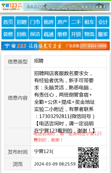 招聘网店客服数名要求女,有经验者优先,新手可带要求:头脑灵活,熟悉电脑,有责任心,两班倒管食宿+全勤+公休+提成+奖金地址实验二小附近,有意者联系:17303292811(微信同号) 【电话咨询时,请一定说明在宁晋123看到的,谢谢!】 |