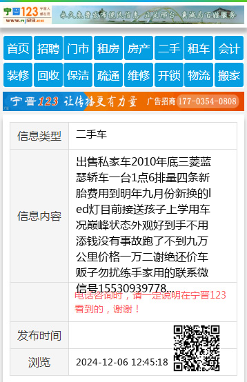 出售私家车2010年底三菱蓝瑟轿车一台1点6排量四条新胎费用到明年九月份新换的led灯目前接送孩子上学用车况巅峰状态外观好到手不用添钱没有事故跑了不到九万公里价格一万二谢绝还价车贩子勿扰练手家用的联系微信号15530939778 【电话咨询时,请一定说明在宁晋123看到的,谢谢!】 |