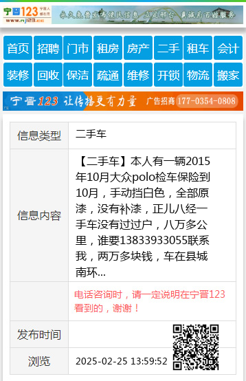 【二手车】本人有一辆2015年10月大众polo检车保险到10月,手动挡白色,全部原漆,没有补漆,正儿八经一手车没有过过户,八万多公里,谁要13833933055联系我,两万多块钱,车在县城南环 【电话咨询时,请一定说明在宁晋123看到的,谢谢!】 |