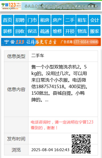 售一个小型双筒洗衣机2。5kg的。没用过几次。可以用来日常洗个小衣服。电话微信18875741518。400买的。150就出。县城自提。小鸭牌的。 【电话咨询时,请一定说明在宁晋123看到的,谢谢!】 |