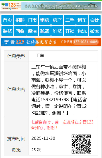 三轮车一辆后面带不绣钢棚,能做鸡蛋灌饼烤冷面,小南海,铁棚小屋一个,可以做各种小吃,煎饼,卷饼,冷面等是,价格便宜,联系电话15932199798 【电话咨询时,请一定说明在宁晋123看到的,谢谢!】 |
