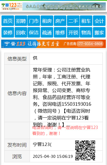 常年受理:公司注册营业执照,年审,工商注册、代理记账、报税、代开发票、年报异常、公司变更、商标专利、食品药品经营许可等业务。咨询电话15503193016(微信同号) 【电话咨询时,请一定说明在宁晋123看到的,谢谢!】 |
