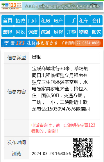 宝联商城北行30米,草场胡同口出租临街独立月租房有独立卫生间淋浴室空调,水电暖家具家电齐全,拎包入住!面积50㎡,交通方便,三幼,一小,二院附近!联系电话:15030947676微信同 【电话咨询时,请一定说明在宁晋123看到的,谢谢!】 |
