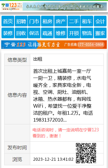 首次出租上城嘉苑一室一厅一厨一卫,精装修,水电气暖齐全,家具家电全新,电视、空调、厨灶、油烟机、冰箱、热水器都有,有网线WiFi,希望找一位爱干净整洁的租户。年租1.2万。电话19831372010 【电话咨询时,请一定说明在宁晋123看到的,谢谢!】 |