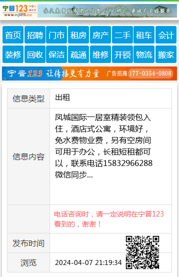 凤城国际一居室精装领包入住,酒店式公寓,环境好,免水费物业费,另有空房间可用于办公,长租短租都可以,联系电话15832966288微信同步 【电话咨询时,请一定说明在宁晋123看到的,谢谢!】 |