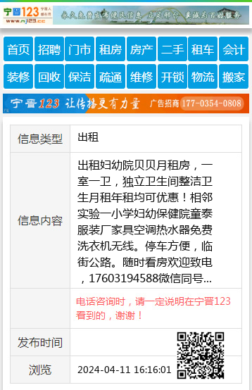 出租妇幼院贝贝月租房,一室一卫,独立卫生间整洁卫生月租年租均可优惠!相邻实验一小学妇幼保健院童泰服装厂家具空调热水器免费洗衣机无线。停车方便,临街公路。随时看房欢迎致电,17603194588微信同号 【电话咨询时,请一定说明在宁晋123看到的,谢谢!】 |