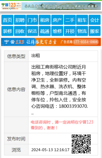 出租工商街移动公司附近月租房,地理位置好,环境干净卫生,全新装修。内有空调、热水器、洗衣机、整体橱柜等,户型南北通透,有停车位,拎包入住,安全放心咨询电话:18003393070 【电话咨询时,请一定说明在宁晋123看到的,谢谢!】 |
