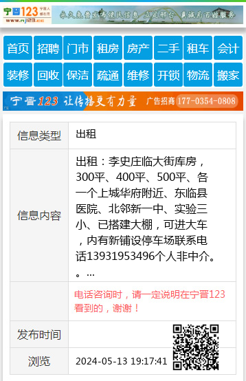 出租:李史庄临大街库房,300平、400平、500平、各一个上城华府附近、东临县医院、北邻新一中、实验三小、已搭建大棚,可进大车,内有新铺设停车场联系电话13931953496个人非中介。。 【电话咨询时,请一定说明在宁晋123看到的,谢谢!】 |