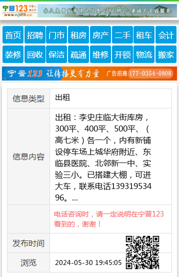 出租:李史庄临大街库房,300平、400平、500平、(高七米)各一个,内有新铺设停车场上城华府附近、东临县医院、北邻新一中、实验三小。已搭建大棚,可进大车,联系电话13931953496。 【电话咨询时,请一定说明在宁晋123看到的,谢谢!】 |
